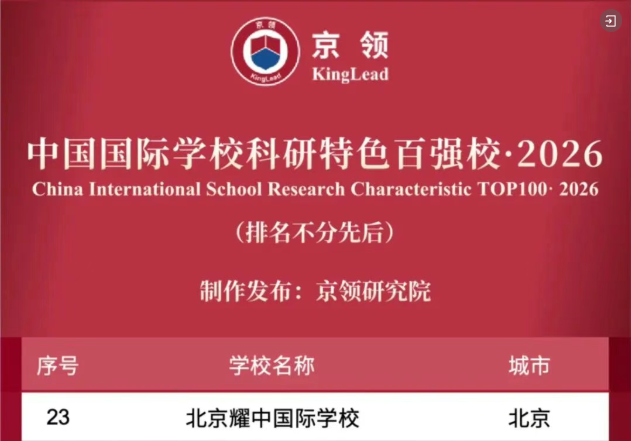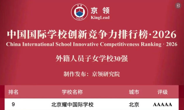 凭借卓越的办学品质与综合实力,北京耀中国际学校成功入选京领2026中国国际学校创新竞争力排行榜・外籍人员子女学校30强,并荣获5A评级。