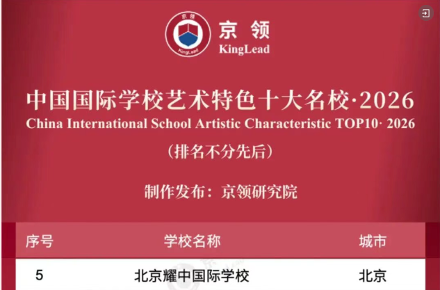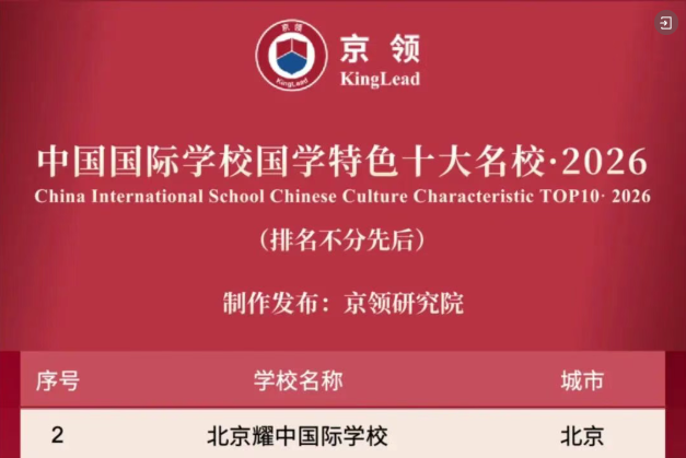 此外,北京耀中国际学校还荣登京领2026中国国际学校科研特色百强校、京领2026中国国际学校艺术特色十大名校,以及京领2026中国国际学校国学特色十大名校。