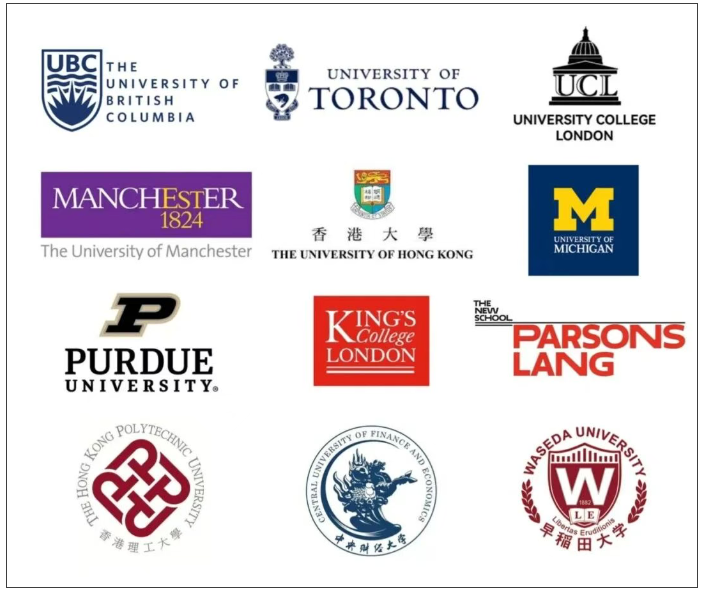 伦敦大学学院、伦敦国王学院、曼彻斯特大学、不列颠哥伦比亚大学、多伦多大学、香港大学、香港理工大学、中央财经大学、早稻田大学、密歇根大学、帕森斯设计学院等。