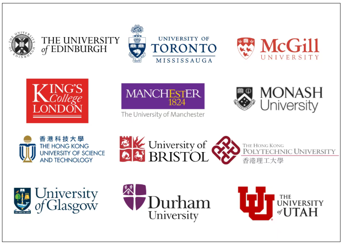 爱丁堡大学、伦敦国王学院、曼彻斯特大学、布里斯托大学、多伦多大学、麦吉尔大学、香港科技大学、香港理工大学、蒙纳士大学(马来西亚校区)、犹他大学等。